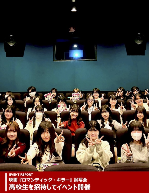 札幌学院大学の学生広報スタッフが高校生を招待してイベントを開催! 今回は12月12日(金)全国公開の映画『ロマンティック・キラー』の試写会を企画・運営。上白石萌歌×高橋恭平(なにわ男子)×木村柾哉(INI)×中島颯太(FANTASTICS)のクアトロ主演作品の公開前「試写会」とあって満席の会場は高校生の熱気に溢れました。
